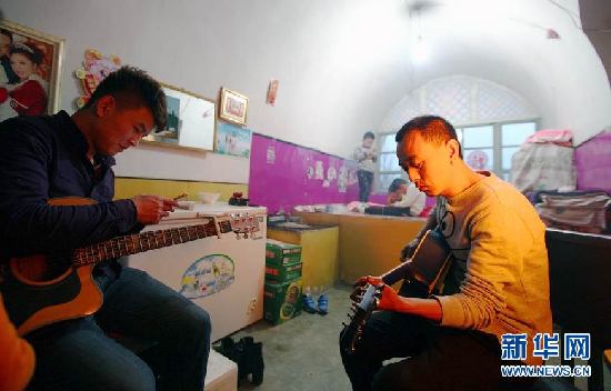 东水界村郝家老大与春节前来探亲的姨弟切磋琴技,他在呼和浩特开有一家广告公司,闲暇时候喜欢玩乐器(2月11日摄)。梁鸿儒/摄