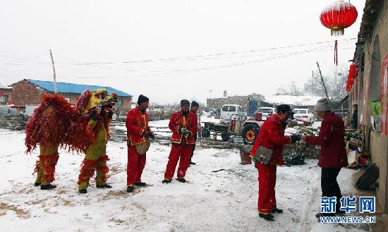 东水界村,每年春节,当地有组织秧歌队挨家挨户拜年的习俗。以前的春节秧歌队都以青壮年为主,队员大概20人。如今因年轻人不愿再参与,秧歌队越来越少,队员的平均年龄也逐渐走高。图为户主正按照习俗向前来拜年的秧歌队表示感谢(2月12日摄)。梁鸿儒/摄