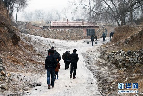 山西朔州市平鲁区北部东水界村,村子的几口水井都位于村前的沟里,每天早晨起来,村民拉着牲口到沟底饮水。图为春节假日回来的年轻人帮家里饮完牲口后往回走(2月12日摄)。梁鸿儒/摄