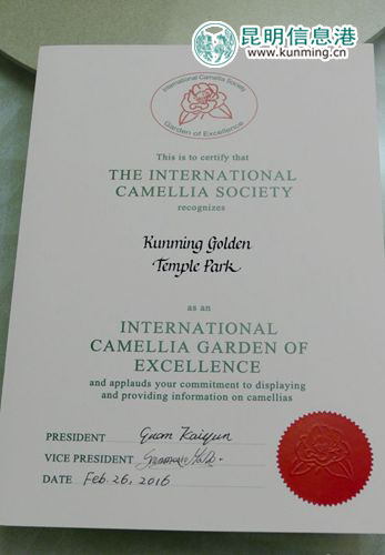 2月21日,“2016大理国际茶花大会暨第十届中国茶花博览会”在大理市启幕。作为国际茶花界的殿堂级盛会,国际茶花大会每两年举办一届。而在大会上颁发的“国际杰出茶花园”荣誉证书, 是国际茶花协会授予的最权威认证。在26日下午的国际茶花大会闭幕式上,金殿名胜区和国内外新增的7个茶花园一起,荣膺“国际杰出茶花园”称号,与金殿一起获得此殊荣的国内公园还有大理玉洱园和重庆万州西山公园。至此,全世界共有国际杰出茶花园30余家。再加上此前已获得此荣誉的中科院昆明植物园,“国际杰出茶花园”云南占3席,成为我国最多的省份。