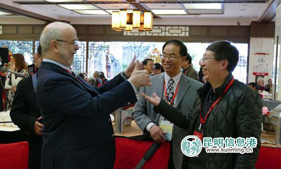 国际茶花协会副主席莫塔先生竖起大拇指,向昆明市金殿名胜区获得“国际杰出茶花园”荣誉表示祝贺。林受里/摄