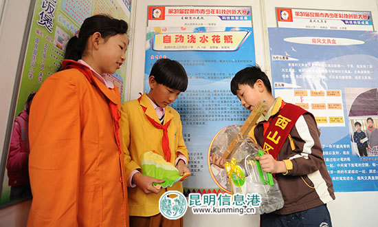 “自动浇水的花瓶”是西山区阳光小学六年级学生邹旻佑的参赛作品。他告诉记者,自己有一次随父母外出旅游,返家后发现水仙花都枯死了,因此他希望发明一种新型花瓶,可以自动浇花,解决人们因忘记浇水或家中短期无人时花枯死的问题。邹旻佑发明的自动浇水花瓶,以废旧塑料瓶为原材料,运用力学杠杆及重力原理,既环保又科学。