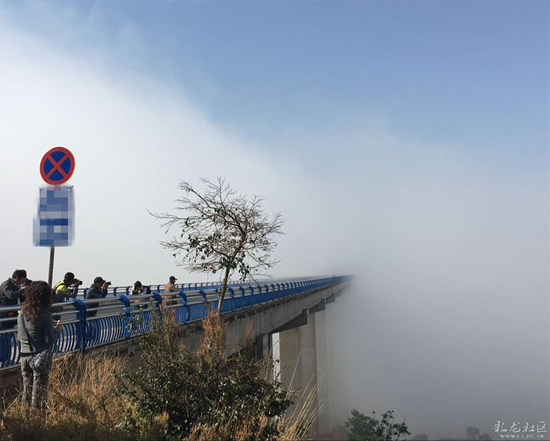 早上8时,彩龙网友搭乘的客车准时从昆明新闻中心门口出发。一小时后,当大家在路边停车休息时,网友发现眼前的公路竟被一片浓雾笼罩,一幅浓雾索桥的壮丽景致让彩龙网友们激动不已。大家纷纷下车开始拍照,已经下车的网友跑回车上拿出“长枪短炮”,抓紧时间对眼前的美景按下快门。