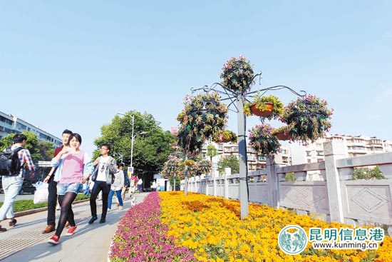 截至目前,北京路已安装碳化木质盛花器15组,栽种橙色孔雀草、矮牵牛、南洲万寿菊、石竹梅、小丽菊等,形成昆明街头的主要风景线。双龙桥头摆放了一组以矮牵牛、五春花、石竹梅、孔雀草等时令花卉为主色块的园林小品。彩云北路结合道路条件,在重要节点、地段分组安装盛花器25组,摆放小丽菊、天竺葵、矮牵牛、南洲万寿菊、三色堇、石竹等。(昆明日报 记者邓磊 通讯员甘露)
