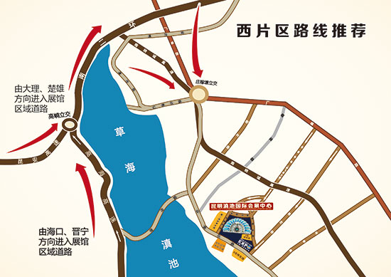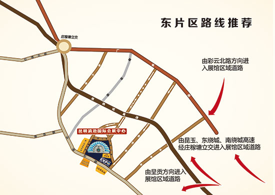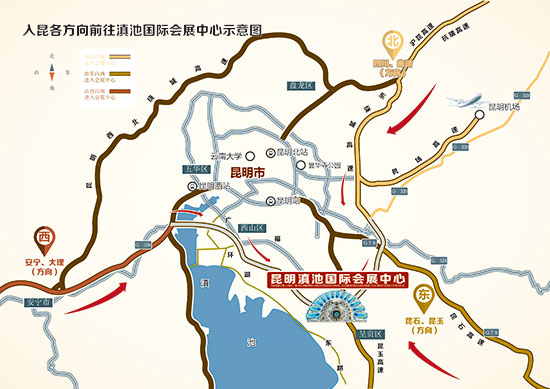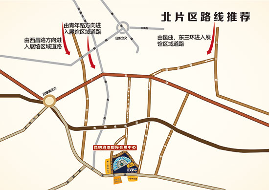 交通导行手册建议,北片区自驾市民可由青年路、西昌路方向或由昆曲、东三环进入展馆区域道路;东片区自驾市民可由彩云北路、呈贡方向或由昆玉、东绕城、南绕城高速经庄稼塘立交进入展馆区域道路;西片区自驾市民可由大理、楚雄方向或由海口晋宁方向进入展馆区域道路。