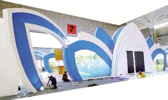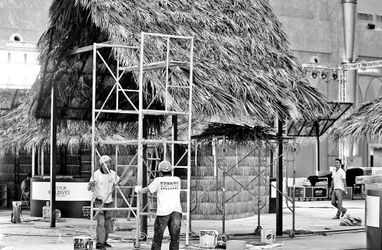 马尔代夫展区,工人们在加紧布展。春城晚报 记者李秋明/摄