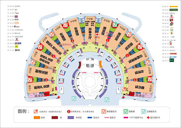 3层共设有12个餐饮点,其中清真餐饮区设在8号、9号南亚馆之间,其余9个展馆餐饮点分别位于1号至6号馆、10号至13号馆旁,2个品牌餐饮点分别位于展馆内环线尽头。此外,在1号馆和13号馆的商业区旁,还设有两个餐饮区。