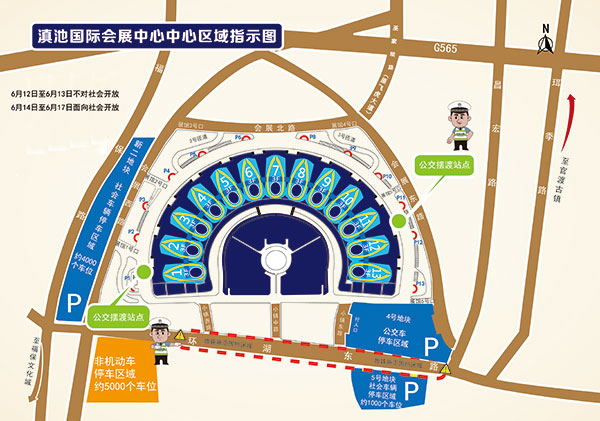 本届展会滇池国际会展中心内总共可提供7140个地下停车位。6月14日到17日,社会车辆经过安检后可停放在1-11号展馆地下停车场,共计5700个车位,实行收费管理。