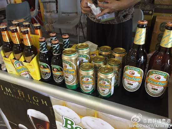 东盟馆老挝啤酒展区,摆放整齐的Beer Lao 已经准备好了,据介绍,始建于1973年的老挝啤酒厂,生产及罐装设备由德国进口,原材料大麦来自法国、啤酒花来自德国,年产啤酒7000万升……小编真是涨姿势了呢!