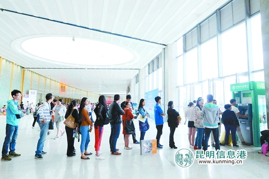 场馆内ATM机前排队取钱的市民。记者杜文蕾/摄