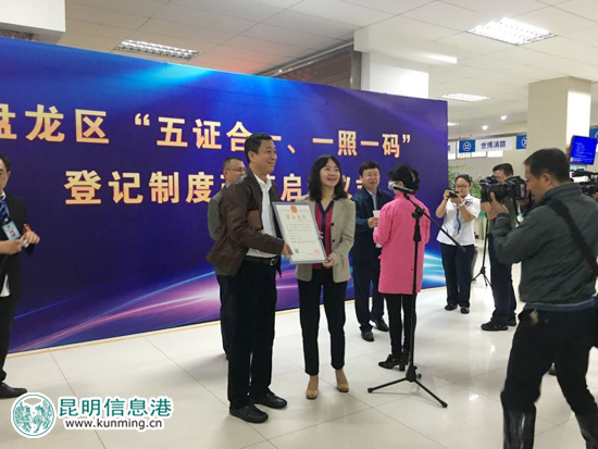 盘龙区区长梁崑向企业颁发盘龙区首份“五证合一”营业执照