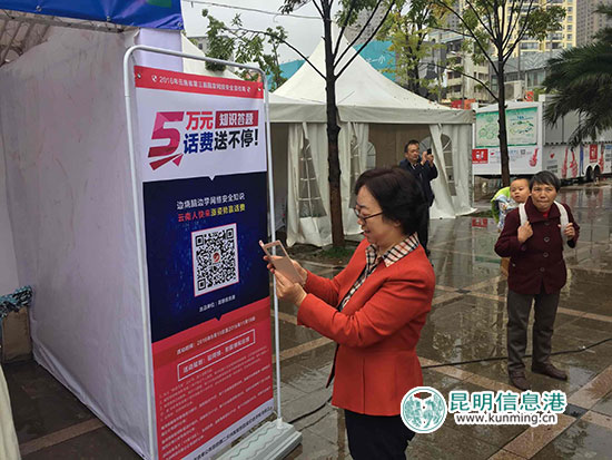 省互联网信息办公室的展位同样人气颇高,众多市民纷纷拿出手机扫码参与“云南省2016年国家网络安全宣传周知识答题”活动。通过答题,市民不仅能增长网络安全知识,还能分享高达5万元的话费奖励。