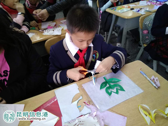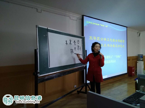 昆明信息港讯 记者李红鸾 2016年11月11日下午,云南省青少年书法协会副主席尹雅丽来到五华区先锋小学给四、五年级的百余名同学教授书法课程。尹老师给同学们讲授了书法的历史,并给同学们介绍了齐白石等书画名家,让学生与书画家"零距离"学习。