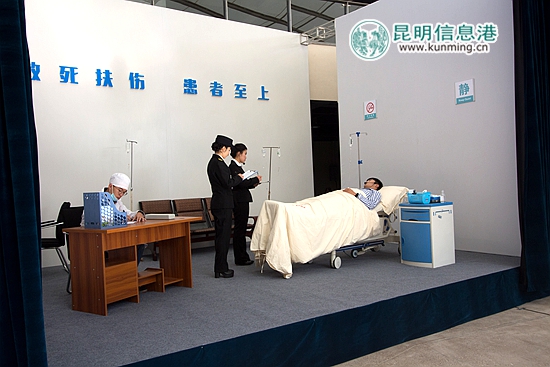 模拟情景为昆明经开区辖区内某企业职工在单位食堂就餐后,陆续出现腹痛、呕吐、腹泻等疑似食物中毒症状。统计发现,约有30多人发病,发病人数持续不断增加,短短2个小时后,发病职工人数已达107人。区、市两级政府根据事态发展趋势,依次启动药品安全突发事件Ⅳ级、Ⅲ级应急响应,按照药品安全突发事件应急预案迅速有效地开展应急处置和救援工作。各部门快速反应,迅速查清事故原因,使得出现问题的患者及时得到了有效救治,事态得到有效控制。应急响应终止后,举行新闻发布会,并做好善后处置工作。