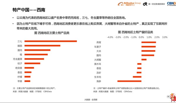 本省消费者对本省土特产的偏好为纬度,云南消费者购买本省销售土特产的购买占比只有13.07%。据悉,年货节期间农村淘宝精选的200种土货,吸引了全国365个城市的消费者抢购,还远销美国、英国、澳大利亚等国家。1月5日至1月11日,淘宝平台上,云南傣乡园7天卖出的玫瑰鲜花饼用掉50亩玫瑰园的新鲜玫瑰。
