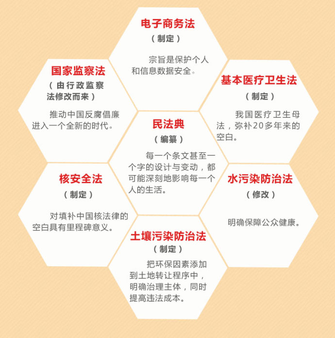 二是围绕构建发展新体制完善法律制度。在民法总则出台后,加快推进民法典各分编的编纂工作,强化对民事权利的保护,完善平等保护产权等法律制度;落实税收法定原则,制定烟叶税法、船舶吨税法等单行税法;制定电子商务法,修改反不正当竞争法、中小企业促进法、农民专业合作社法、证券法、标准化法等,着力健全现代市场体系。