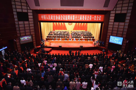 昆明信息港·昆明日报 记者马雪荣 18日,伴随着雄壮的国歌声,中国人民政治协商会议昆明市第十三届委员会第一次会议在昆明会堂开幕。