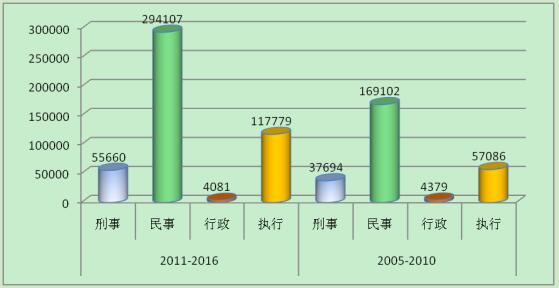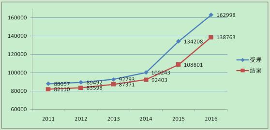 六年来,全市法院共受理各类案件617281件,审结593046件。其中,中级法院受理210892件,审结206144件,分别比前六年上升25.9%和25.2%。2016年全市法院共受理各类案件162998件,审结138763件,分别比上年上升21.5%和27.5%。