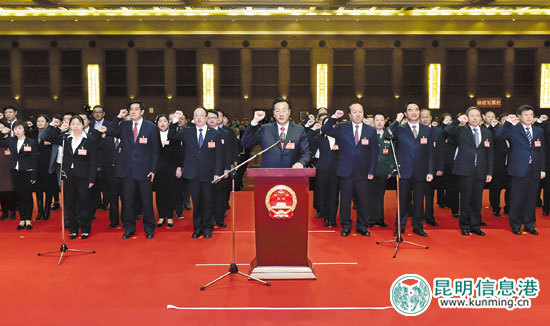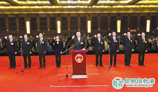 由王喜良领誓,新当选的昆明市人民政府市长、副市长,昆明市中级人民法院院长集体进行宪法宣誓。记者王俊星 杨艳辉 李海曦/摄