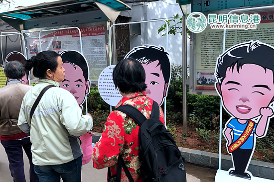 当日上午,记者来到关上石油小区,刚一进大门就看到道路两旁摆放着10位官渡区道德模范人物、身边好人的卡通画像,吸引众多居民驻足观看,还有志愿者对参观卡通人物的居民进行解说。
