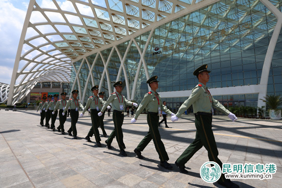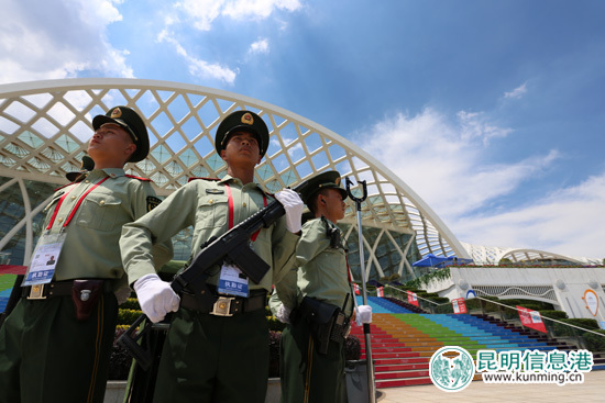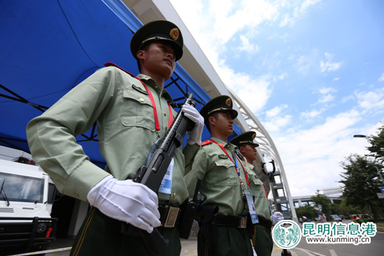 昆明信息港讯 记者廖拓溪 通讯员胡程 6月12日,为期7天的2017南亚东南亚国家商品展暨投资贸易洽谈会(以下简称“商洽会”)在昆明滇池国际会馆中心盛大开幕。作为本次会展安保任务的主力军,武警云南总队第二支队按照突出重点、立体防范、关口前移、超前处置、精心组勤、树好形象指导要求,组织千余名武警官兵奔赴在安保一线,成为“商洽会”上又一道靓丽的风景线。