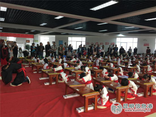 礼仪老师带领小朋友们进行文明礼仪培训,通过正衣冠、朱砂启智、击鼓明志、启蒙书写等形式,庄重而严肃地举行开笔礼。小朋友们着隽雅的汉服,言志向、拜谢父母,并齐声诵读《弟子规》,约400余小朋友、老师、家长、文化志愿者参加培训活动。
