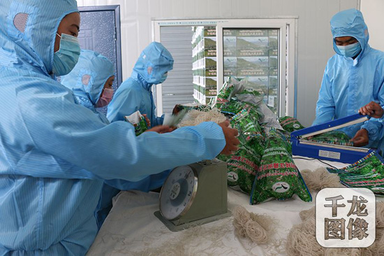 8月14日,“喜迎党的十九大·全国网络媒体西藏行”采访团来到位于日喀则市的西藏藏雄特色农产品科技发展有限公司,除朋必外,该公司也生产藏豌豆粉条。图为工作人员正在包装粉条。千龙网记者 马文娟摄