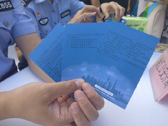 网络安全宣传同样走进了商圈。在徐汇区恒隆广场,两位徐汇公安分局网安支队的民警组织起有奖答题活动,他们自制了几十张“网络安全”知识答题卡,随机抽三张答对两张,即可领走纸巾、牙膏等奖品,摊位前排起了近10人的队伍。