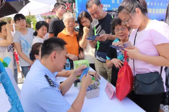 文化活动中心广场的大屏幕上,“网络安全为人民,网络安全靠人民”标语清晰可见。来自工商银行、中国电信、东方信息苑、劲力律师事务所的共建单位和志愿者分别设摊,围绕防电信诈骗、防网络诈骗、青少年网络安全、网络信息法律维权等内容,为现场居民进行讲解。