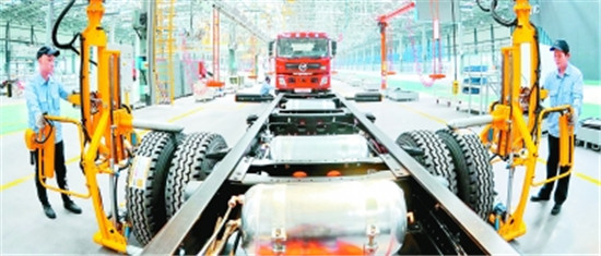 工人在中航工业(邢台)卡车总装车间内工作。新华社发