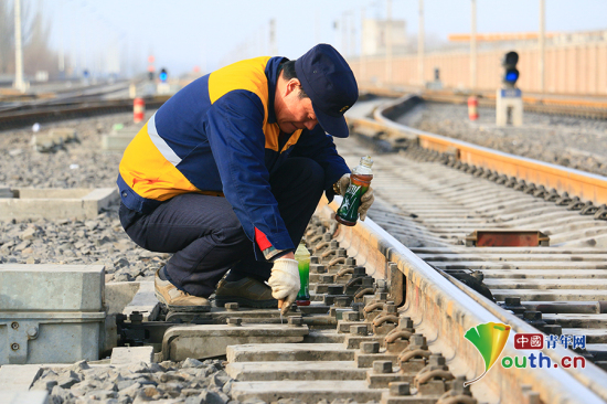 农历正月初八这天,邰芳鹏和工区3名年轻职工一同到现场,对阿克苏站信号机和道岔进行巡视检查。中国青年网通讯员 姚旭东 摄
