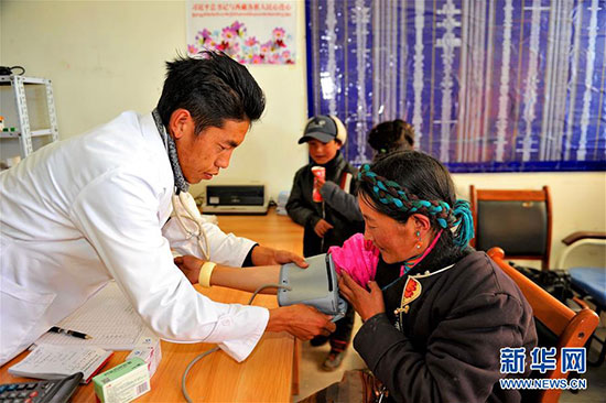 普玛江塘乡卫生院全科医生旺扎为农牧民查体(2018年1月14日摄)。2014年,旺扎从西藏藏医学院毕业,来到条件艰苦的乡卫生院工作,承担全乡282户近1100人的卫生保健任务。新华社记者张汝锋摄