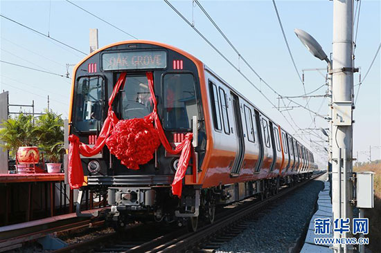 中车长春轨道客车股份有限公司研制的首批美国波士顿橙线地铁车在长春下线,成为首次登陆美国市场的国产轨道交通装备(2017年10月16日摄)。新华社记者段续摄
