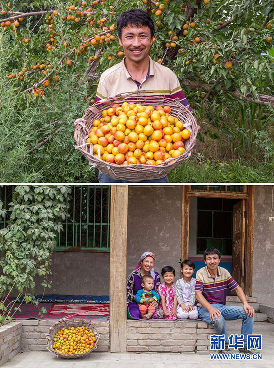 拼版照片:上图为新疆阿克陶县巴仁乡古勒瓦克村村民胡达拜尔迪·巴拉提在自家杏园里展示巴仁杏;下图为胡达拜尔迪·巴拉提一家在新盖的富民安居房前合影(2017年7月11日摄)。胡达拜尔迪·巴拉提一家靠种植巴仁杏实现脱贫。2016年,他将政府提供的扶贫资金投入古勒瓦克村杏产业专业合作社,分红得到5000元。新华社记者岑云鹏摄