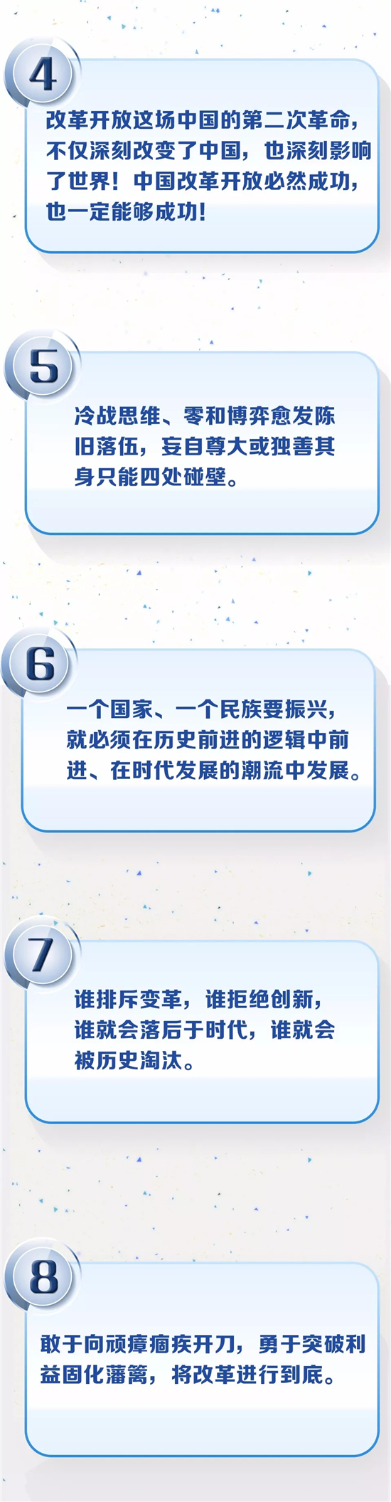 习主席在演讲中,对中国改革开放伟大成就、重要经验和启示、世界意义和影响,以及在新的历史当口中国将如何推动对外开放再扩大、深化改革再出发作出最权威的阐述。
