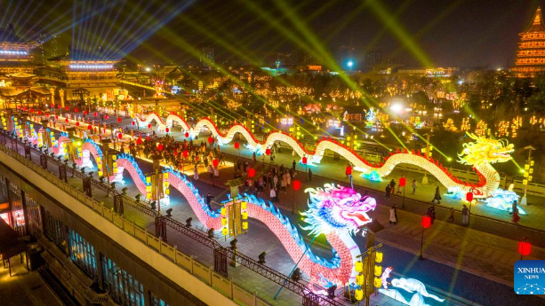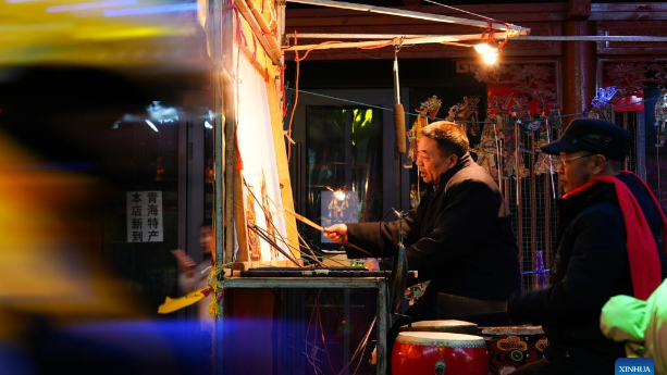 n a winter night in Xining, capital city of northwest China's Qinghai Province, a beam of light cuts through the cold, casting figures in red and green lea...