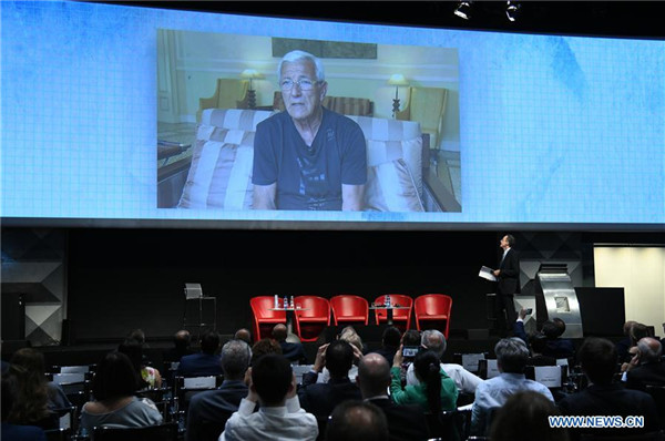 Marcello Lippi (on screen), head coach of Chinese national football team, speaks in a video interview at the second edition of the conference "Italy and the new Silk Roads" in Milan, Italy, on July 5, 2019. Few months after Italy signed a Memorandum of Understanding with China on the Belt and Road Initiative (BRI), experts from both countries met here on Friday to address common future challenges in a perspective of growing cooperation chances. (Xinhua/Alberto Lingria)