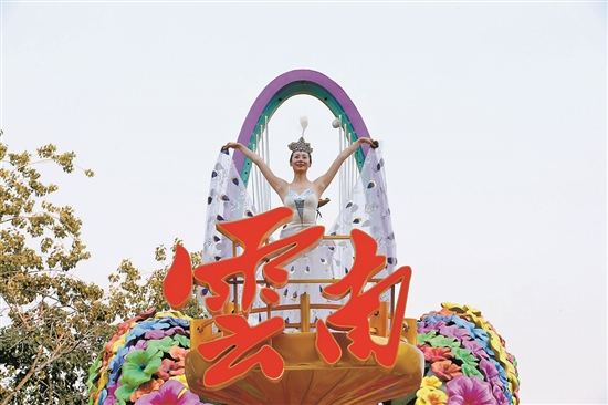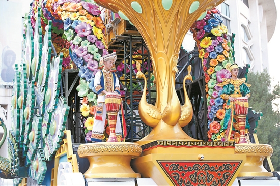 The "Colorful Yunnan" Float is 15 meters long, 6 meters wide and 9.6 meters high. All the parts have extent meanings. For example, Elephant symbolizes national unity and harmony. Two gorgeous flower-pillars symbolize green ecology of Yunnan, which means that Yunnan has natural landscapes and splendid national culture, and is a pleasant and healthy living destination. The golden bridge above the two pillars symbolizes that Yunnan is trying to integrate into the “Belt and Road” Initiative.