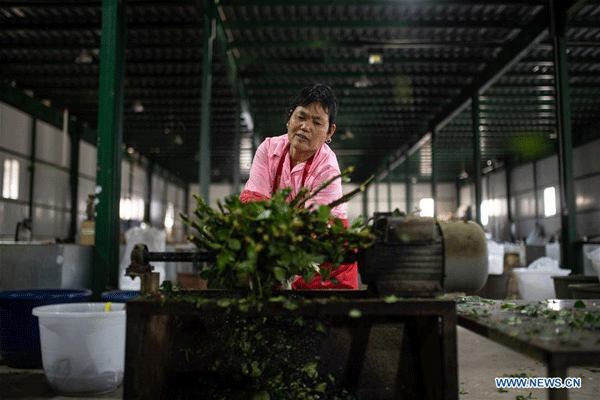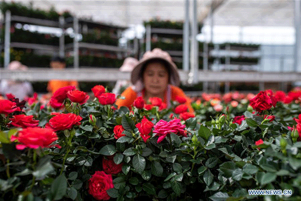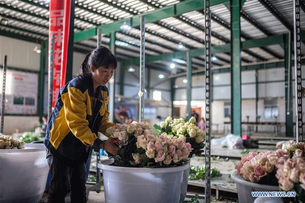A staff member sorts out flowers in Jinning District of Kunming, capital of southwest China's Yunnan Province, April 2, 2020. Jinning District of Kunming has been developing flower planting industry in recent years as a way to boost the income of local people. In 2019, the flower planting area in this district was about 53,900 mu (about 3593 hectares). (Xinhua/Hu Chao)