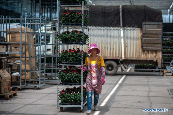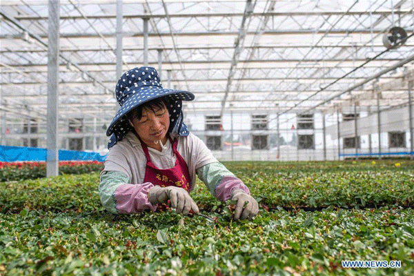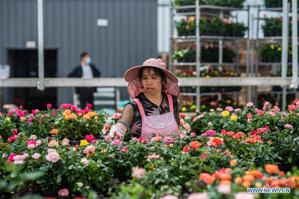 A staff member trims flowers in Jinning District of Kunming, capital of southwest China's Yunnan Province, April 2, 2020. Jinning District of Kunming has been developing flower planting industry in recent years as a way to boost the income of local people. In 2019, the flower planting area in this district was about 53,900 mu (about 3593 hectares). (Xinhua/Hu Chao)