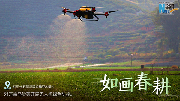 Drones help plant potatoes in Honghe prefecture on March 5. [Photo provided by the publicity department of Shiping county.]