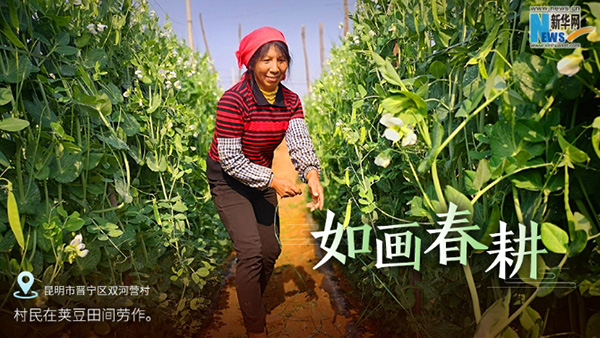 Villagers work in pea fields on March 24. [Photo provided by the publicity department of Jinning district.]