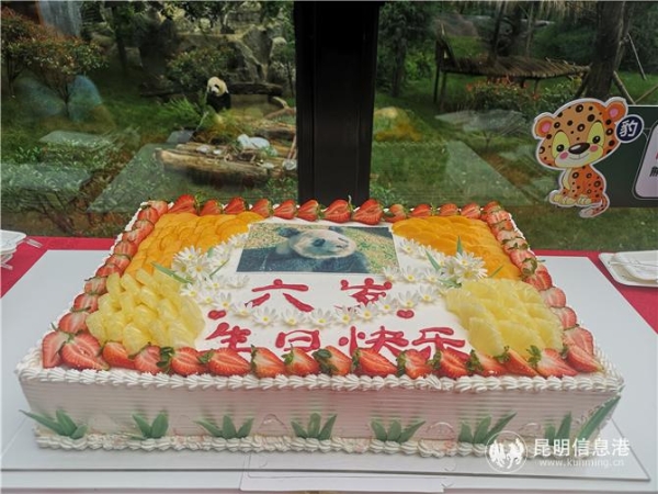 The cake particularly designed for Maozhu consists of ice cubes, dragon fruits, half a cantaloupe, chopped apples and bamboo leaves. Besides, six bamboo shoots and some carrots are placed as decorations.
