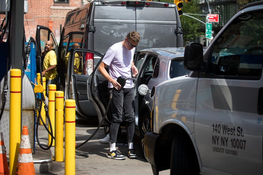 A man fuels a vehicle at a gas station in New York, the United States, Sept 13, 2022. [Photo/Xinhua]
