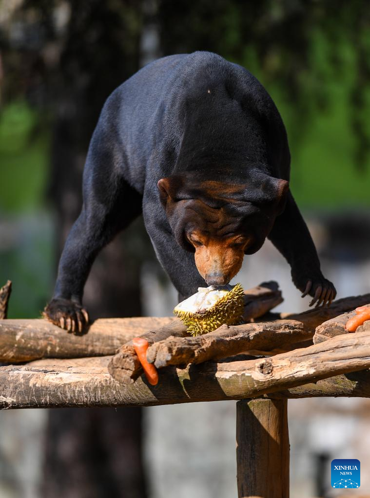 A sun bear enjoys a durian as "festive food" ahead of the upcoming Lantern Festival at Yunnan Wild Animal Park in Kunming, southwest China's Yunnan Province, Feb. 4, 2023. (Xinhua/Jiang Wenyao)