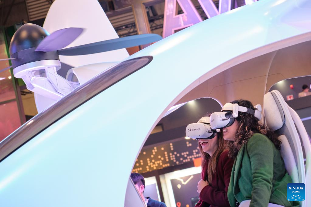 Visitors try on VR headsets at the 2023 edition of the Mobile World Congress (MWC) in Barcelona, Spain, on Feb. 27, 2023. The 2023 edition of the Mobile World Congress (MWC) kicking off Monday in Barcelona saw a strong return of Asian participants, according to the organiser of the city's largest annual event. (Xinhua/Meng Dingbo)
