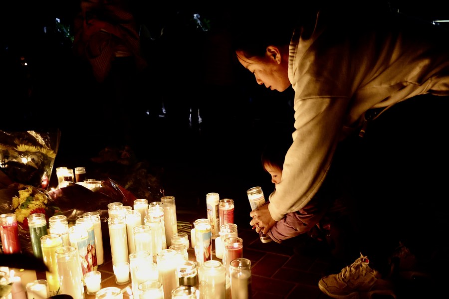 People place a candle to mourn victims of a mass shooting in front of the city hall of Monterey Park, California, the United States, on Jan. 23, 2023. Hundreds of people gathered at a memorial for the 11 killed and nine wounded in the shooting. (Xinhua)