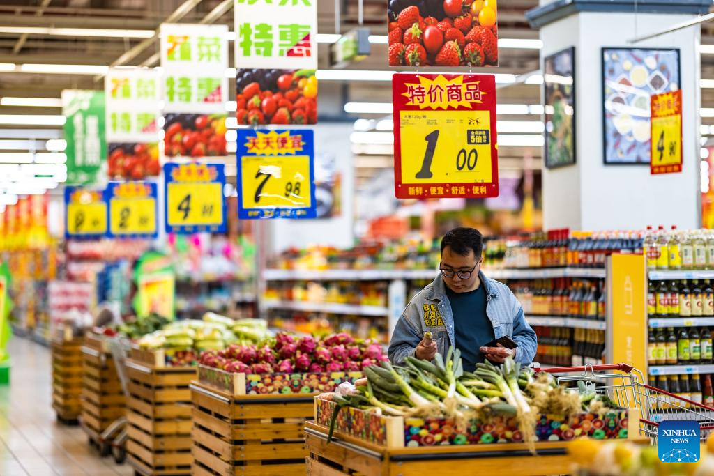 A consumer shops at a supermarket in Shijiazhuang, north China's Hebei Province, April 11, 2023. China's consumer prices registered a mild growth in March, in sharp contrast to the persistent global inflation, official data showed.