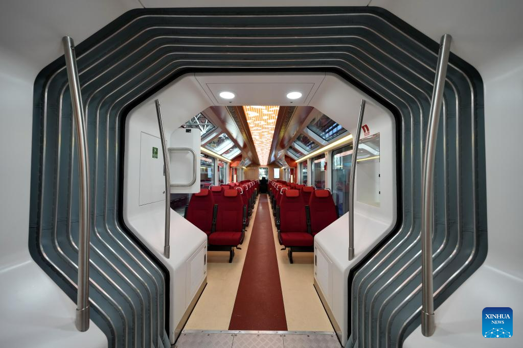This photo taken on June 6, 2023 shows an interior view of a new-energy light rail train made by CRRC Tangshan Co., Ltd. for Argentina in Tangshan, north China's Hebei Province. (Xinhua/Gao Bo)
