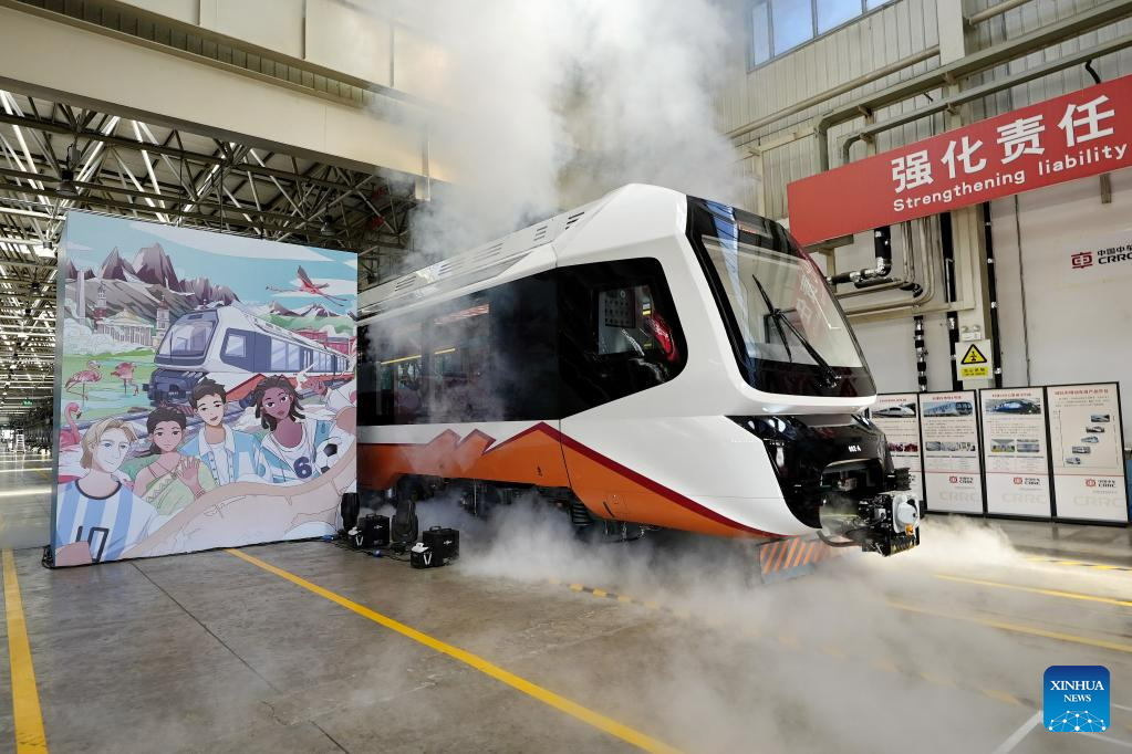 The first new-energy light rail train made by CRRC Tangshan Co., Ltd. for Argentina comes off the production line in Tangshan, north China's Hebei Province, on June 6, 2023. (Xinhua/Mu Yu)